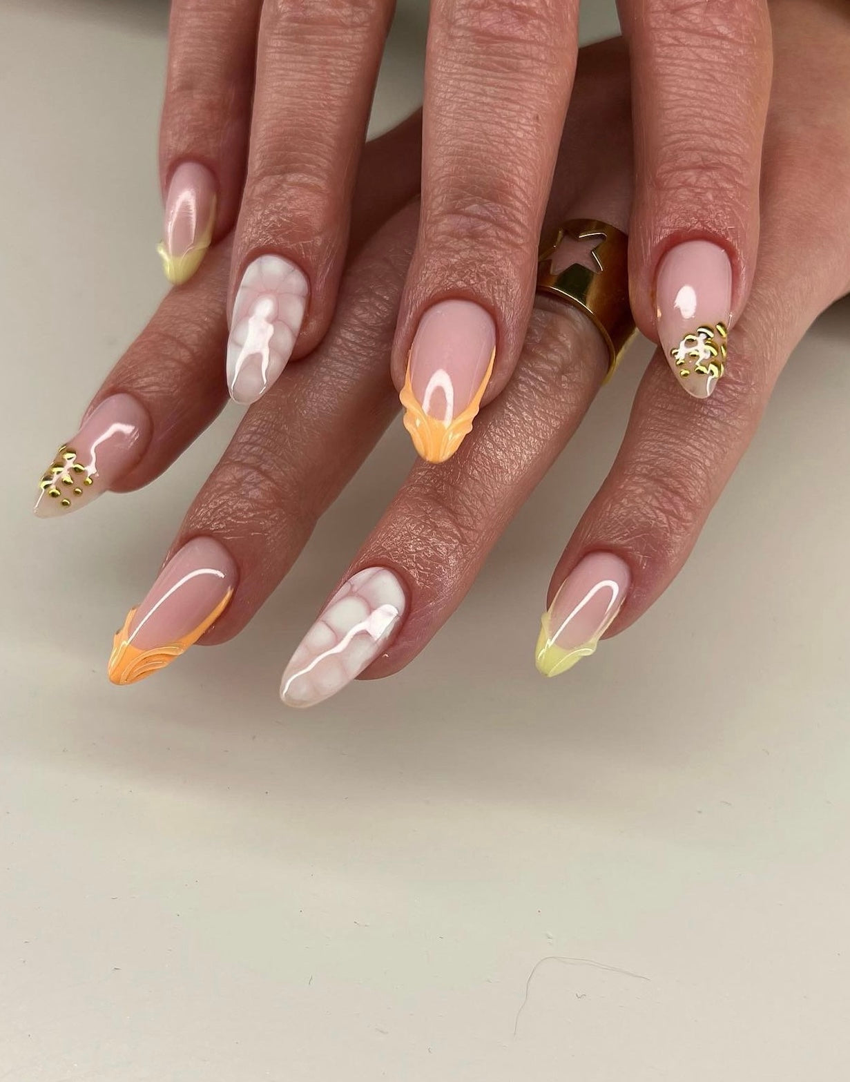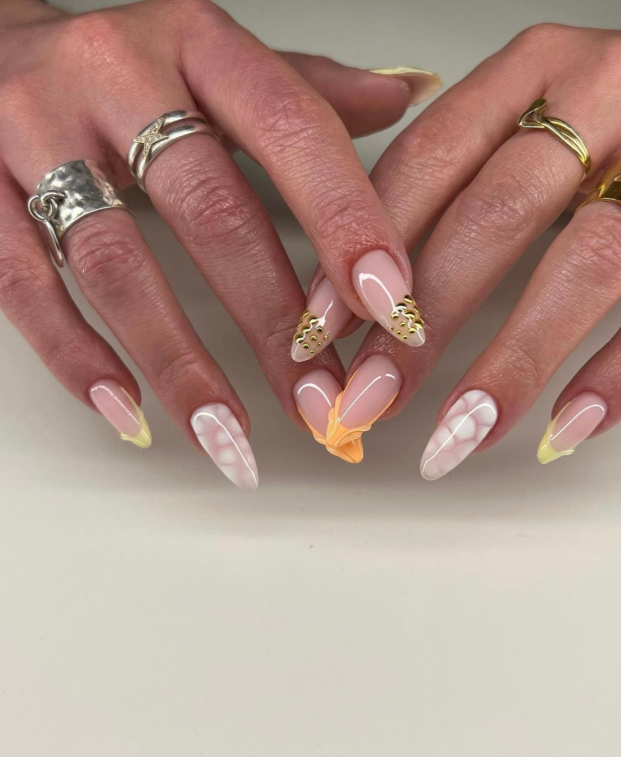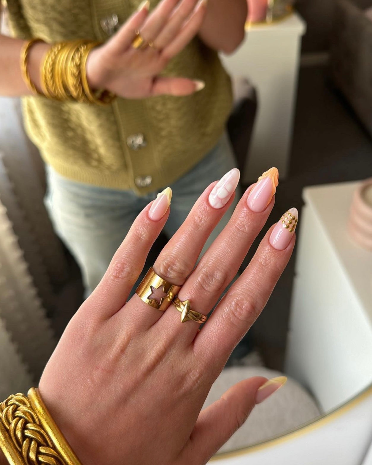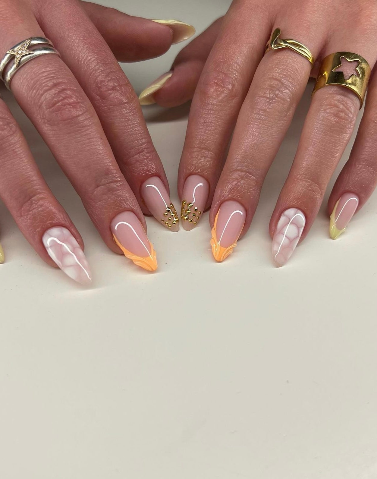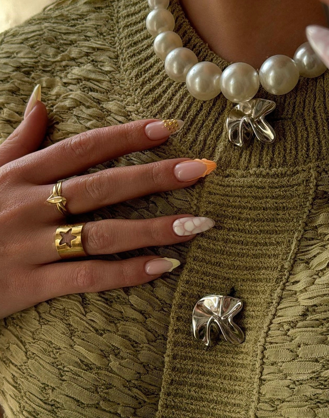 Enhance your next city getaway with the gorgeous Monaco set. The almond shape and professionally handmade design combine muted color 3D French tips, gold accents, and white water drops for an unreal look. These nails are perfect for a touch of luxury on your next trip.