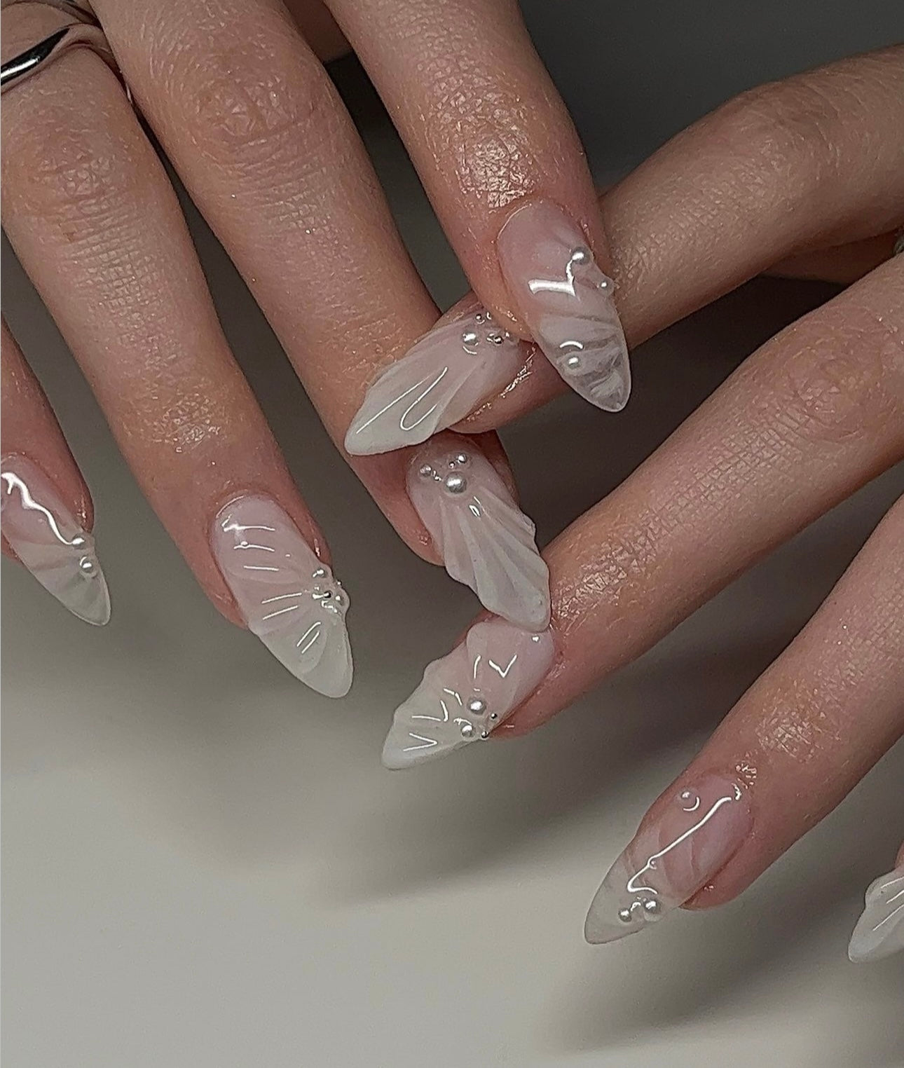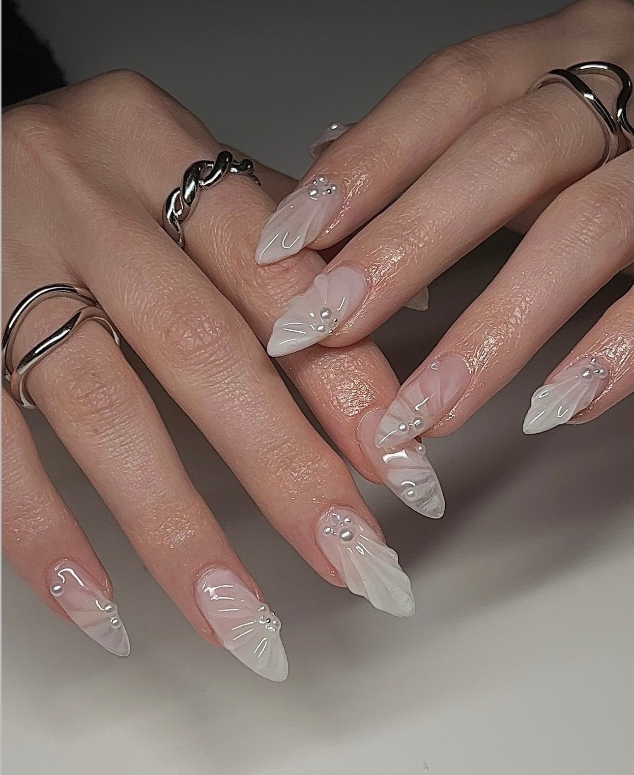Milky white Almond shaped base with 3D gel artwork and pearlescent accent on top.