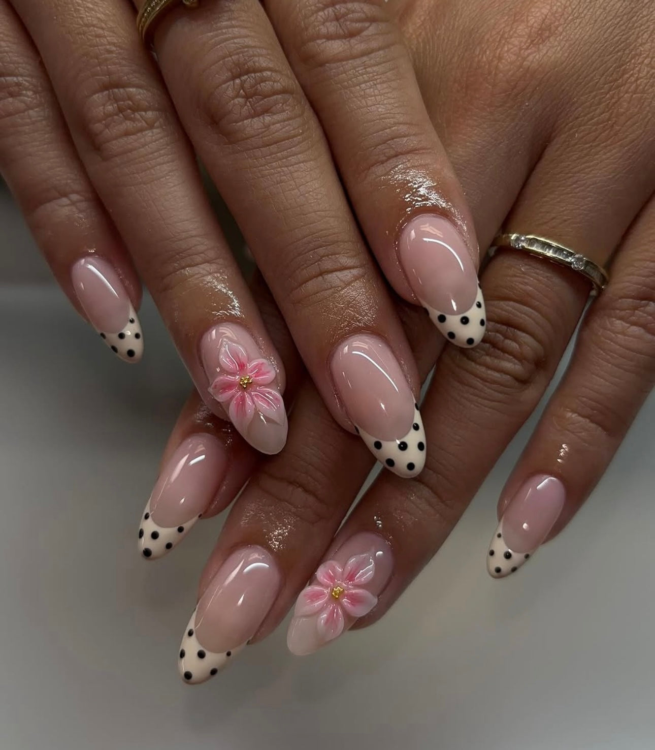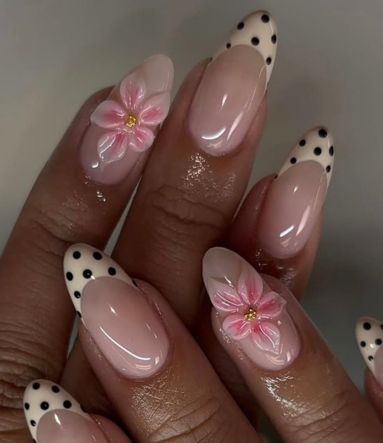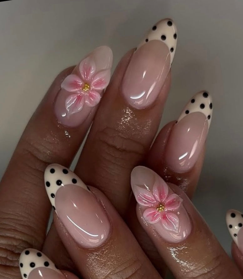 Almond Vibe: Polka dot femininity with a floral twist.