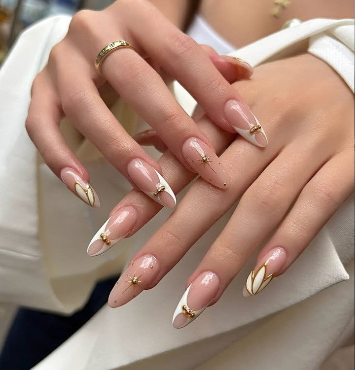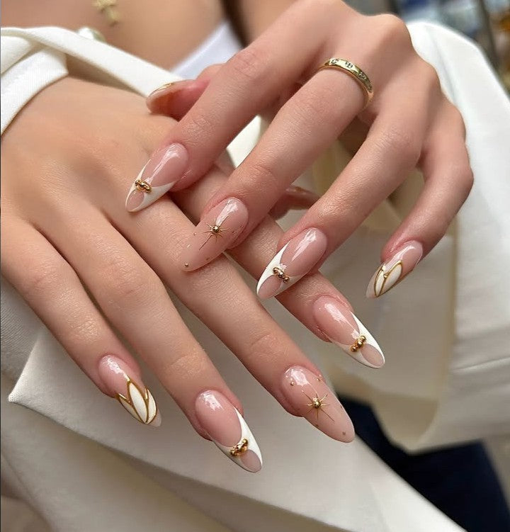 An exquisite French tip design enhanced with gold accents and miniature studs. This Luxurious combination of white, nude, and metallic detail exudes glamour while staying