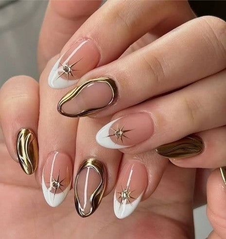 A captivating fusion of white French tips, gold molten borders, and celestial star accents. A